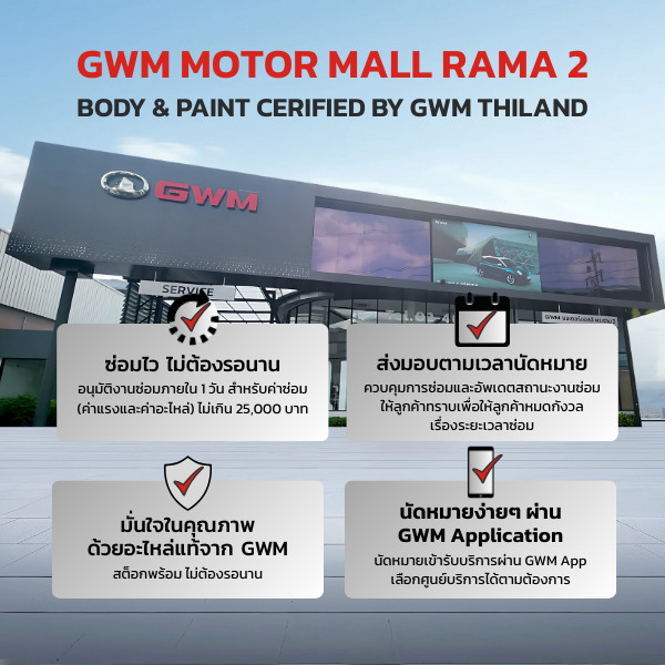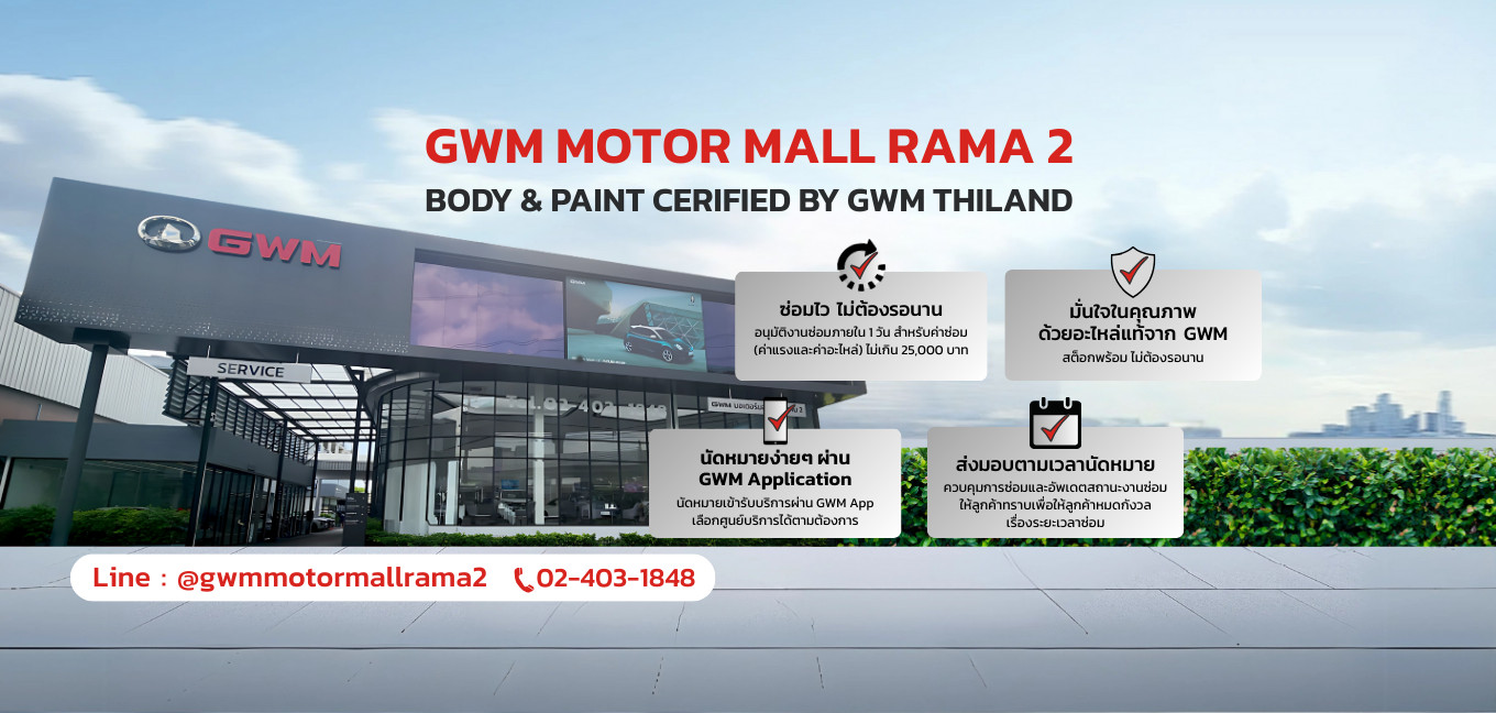 เพียงทำการนัดหมายผ่านแอปพลิเคชัน GWM หรือติดต่อนัดหมายผ่านศูนย์บริการ GWM พระราม 2 โทร. 02-403-1848